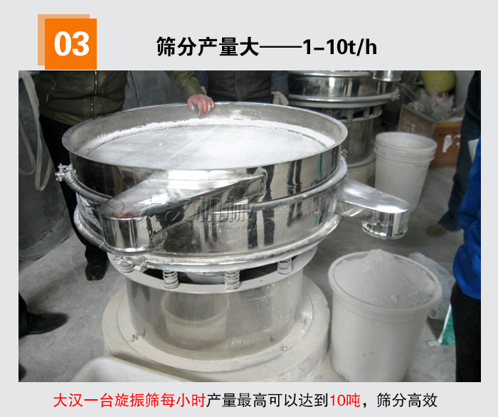 篩分粉類物料時,一般對產量也有所要求,但是考慮到粉狀物料的篩分難度,選擇普通振動篩可能會造成產能低下等問題,而旋振篩采用法蘭電機,動力大,可以增加粉類物料的篩分產量,通過大漢廠家反復在不同的場合對不同物料進行測試,從而得出旋振篩的平均產量,能夠完全符合粉狀物料的用戶篩分要求,大漢一臺旋振篩每小時產量高可以達到10噸,篩分高效。