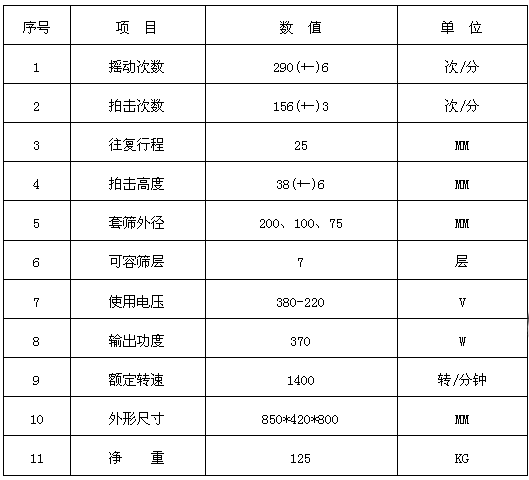 二、齒輪式拍擊篩技術(shù)參數(shù):本機(jī)符合國際標(biāo)準(zhǔn)要求(見表一)
