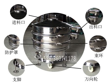 移動式不銹鋼旋振篩簡介:移動式不銹鋼旋振篩底部加裝萬向輪方便移動,可根據現場的需要安裝使用