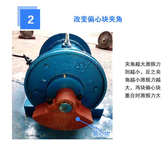 振動電機(jī)通過改變偏心塊夾角的大小來調(diào)節(jié)偏心塊,夾角越大激振力則越小,反之夾角越小激振力越大,兩塊偏心塊重合時激振力大。