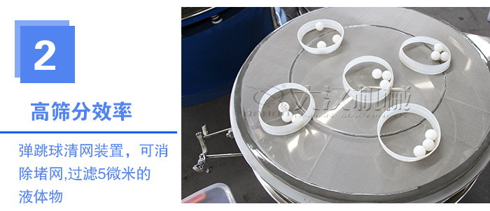 篩網利用率高,篩網下可設彈跳球清網裝置,可消除堵網現象,加緣式旋振篩可以過濾5微米的液體物料,部件無死角,易清洗消毒。