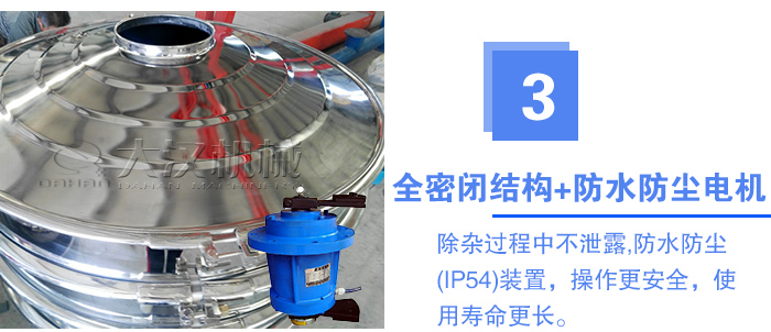 采用全密閉結構,可以保證液體物料在除雜過程中不泄露,不影響篩分效率。另外,我們加緣式旋振篩使用的是大功率電機,具有防水防塵(IP54)裝置,操作更安全,使用壽命更長。