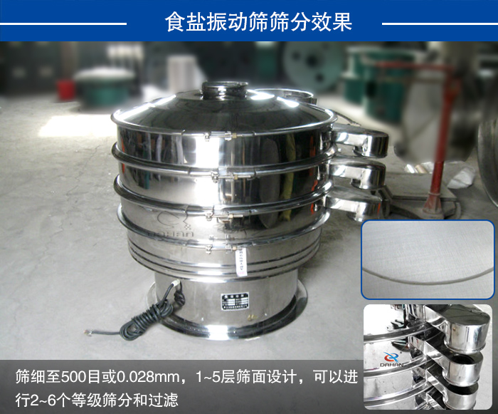 大漢食鹽振動篩細至500目或0.028mm,1~5層篩面設計,可以進行2~6個等級篩分和過濾,保證了食鹽振動篩的篩分量,并且大漢食鹽振動篩整機采用304不銹鋼材質,振動篩密封件材質要選擇硅膠材質,可以保證食鹽在篩分過程中不被污染,進一步提高了食鹽的篩分精度。