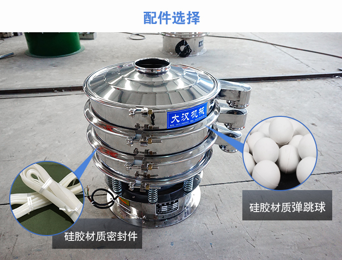 為了配合不銹鋼旋振篩篩分的潔凈性,要求不銹鋼旋振篩的相關(guān)配件也需要達到一定的標(biāo)準(zhǔn),其清網(wǎng)裝置-彈跳球和密封裝置-密封件要采用食品硅膠材質(zhì),以防止對物料造成一定的污染性。